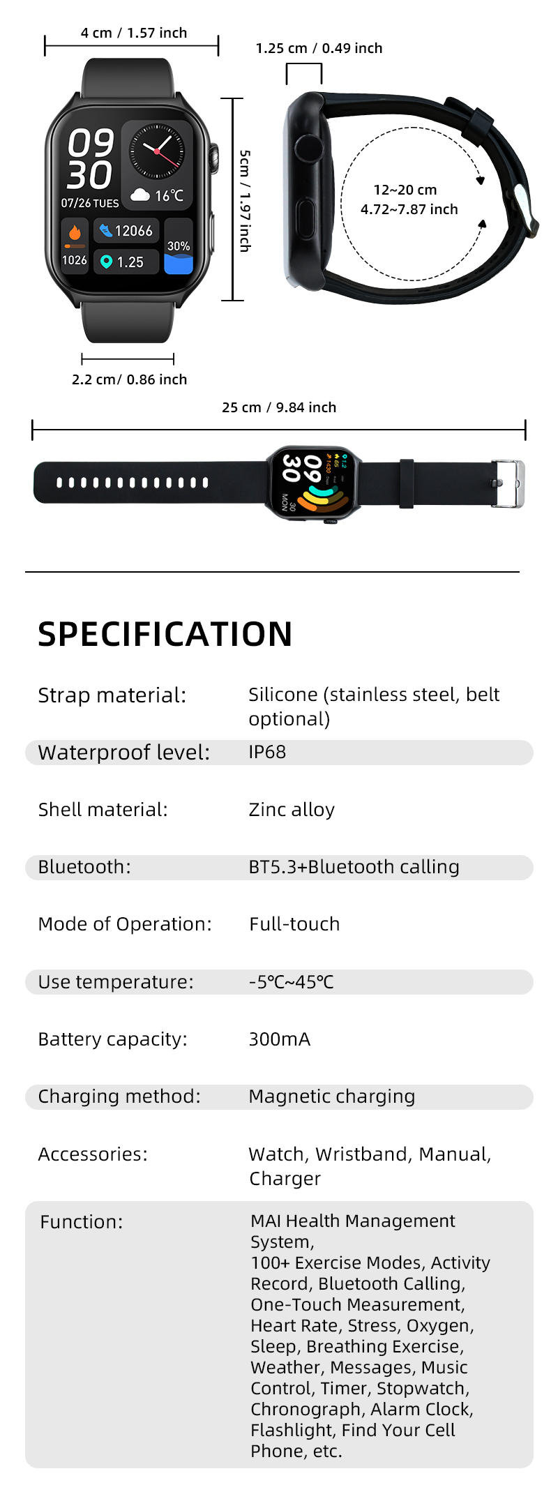 • Hoofdfunctie: Speciale functies/Gezondheidsbewaking/Sporttracking/APP-meldingen/Taalinstellingen/Bluetooth-oproep/muziek afspelen